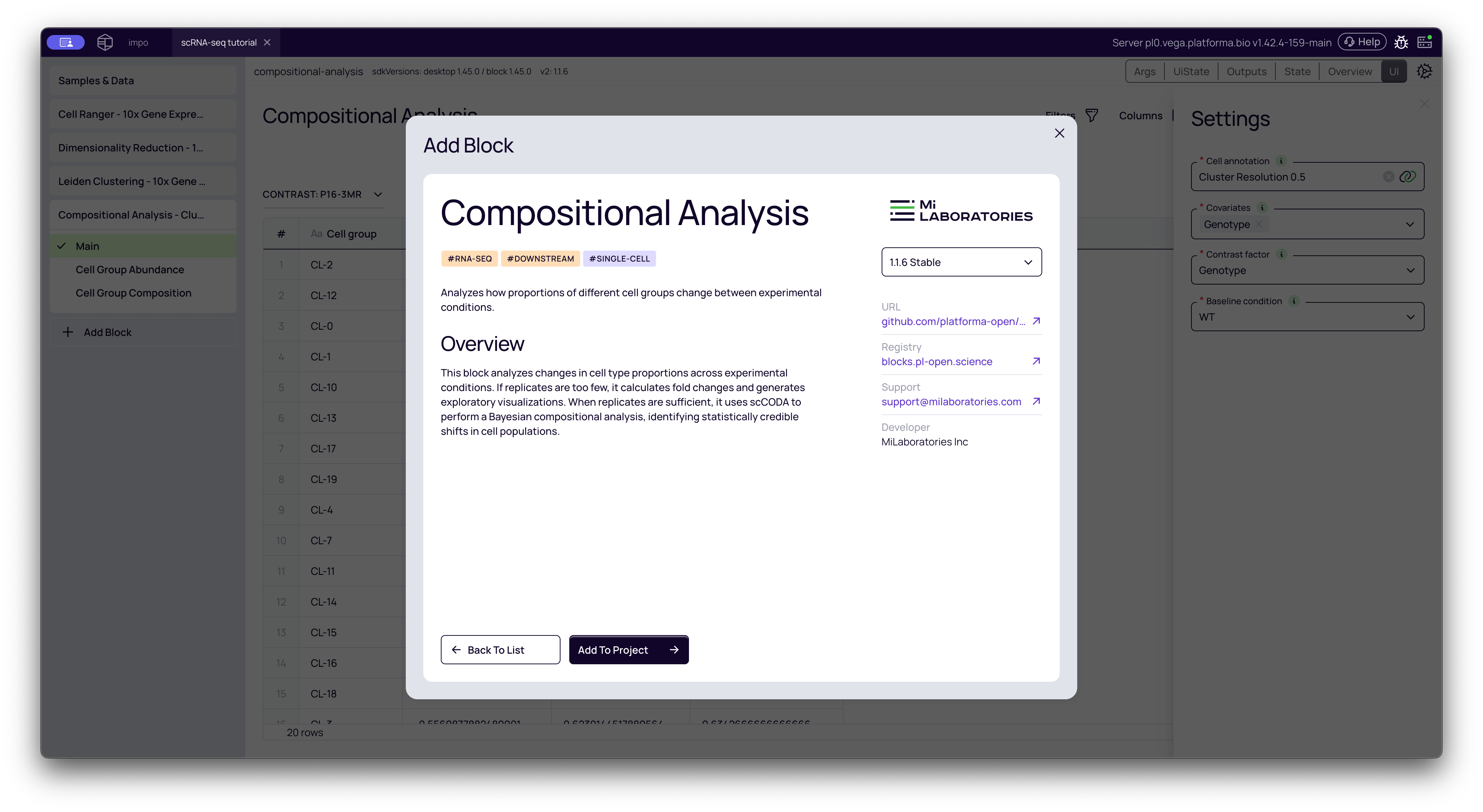Leiden Clustering), click the Add Block button. - Use the search bar to find and select the Compositional Analysis block.
