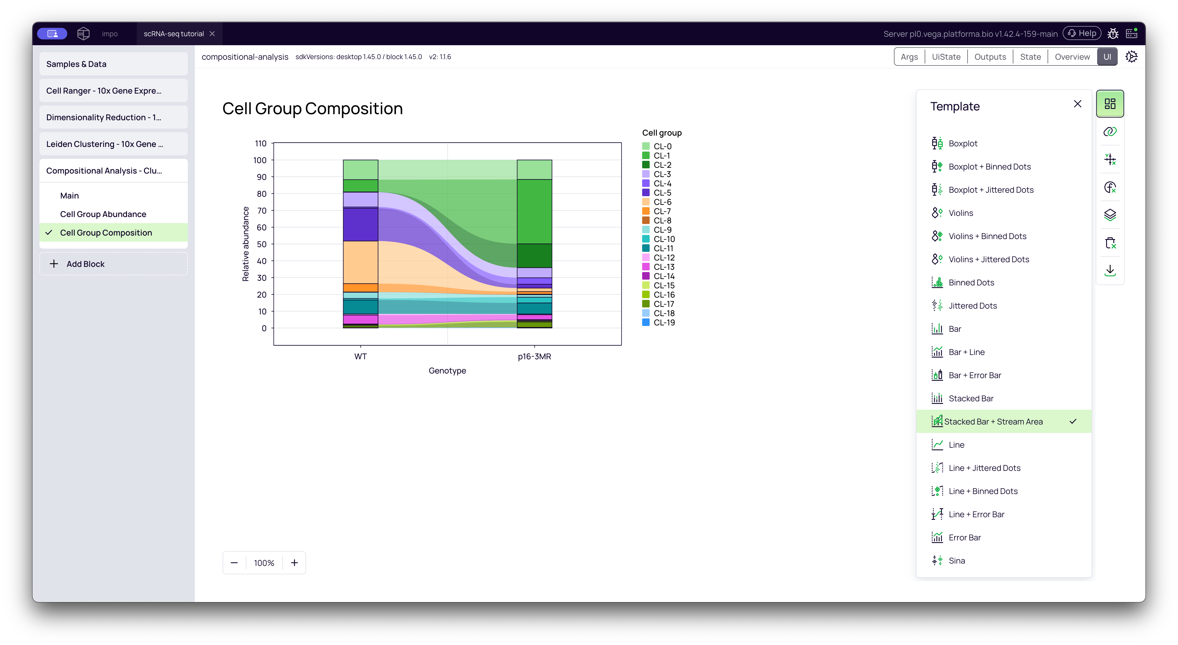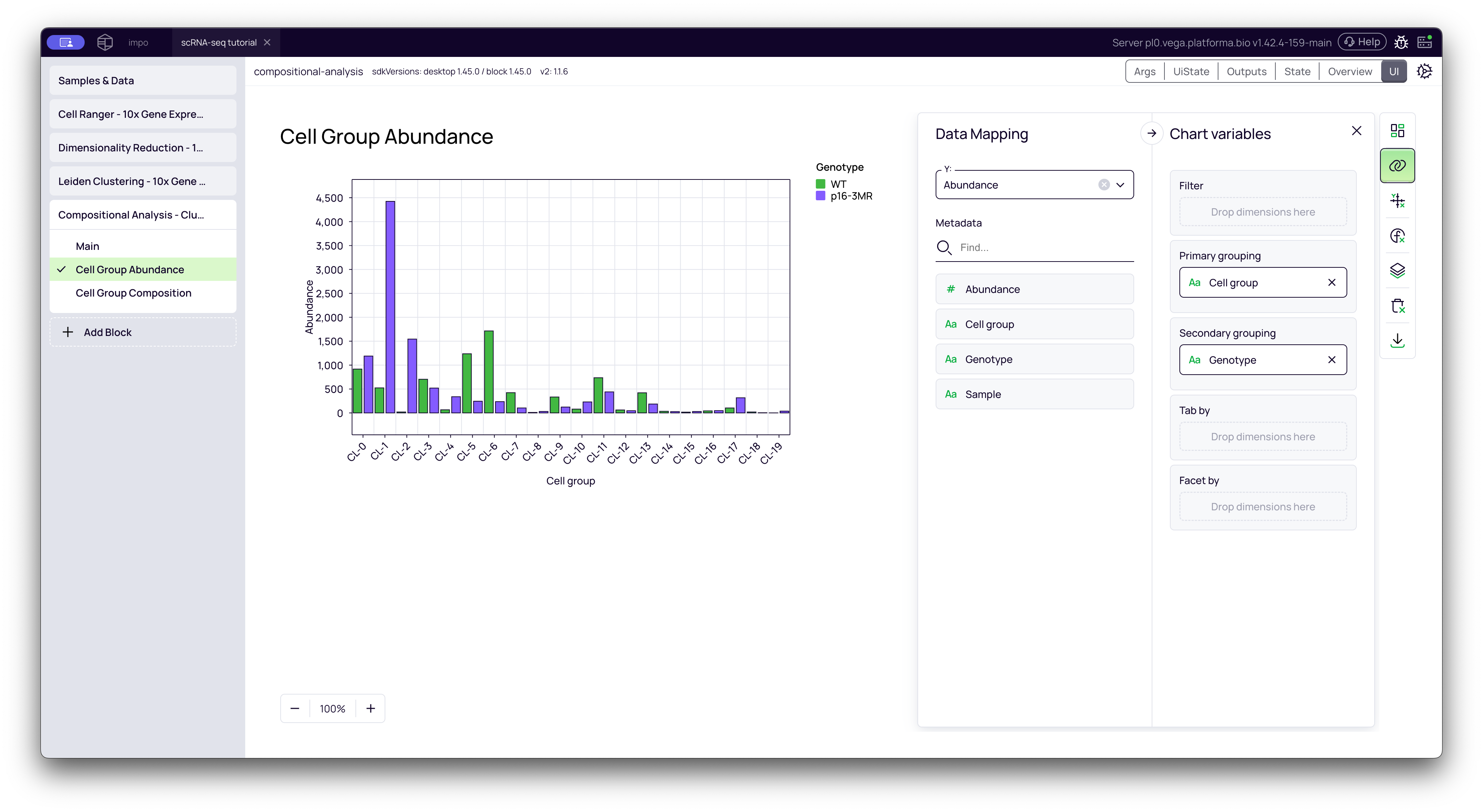 The block generates a Main table and two powerful interactive plots: Cell Group Abundance and Cell Group Composition.